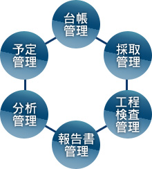 本システムは、お客様の各分析台帳管理の始まり、サンプルの採取計画、分析測定指示、分析測定入力、各報告書発行、販売管理、各種統計資料の作表までの一連の管理が行えます。